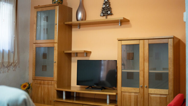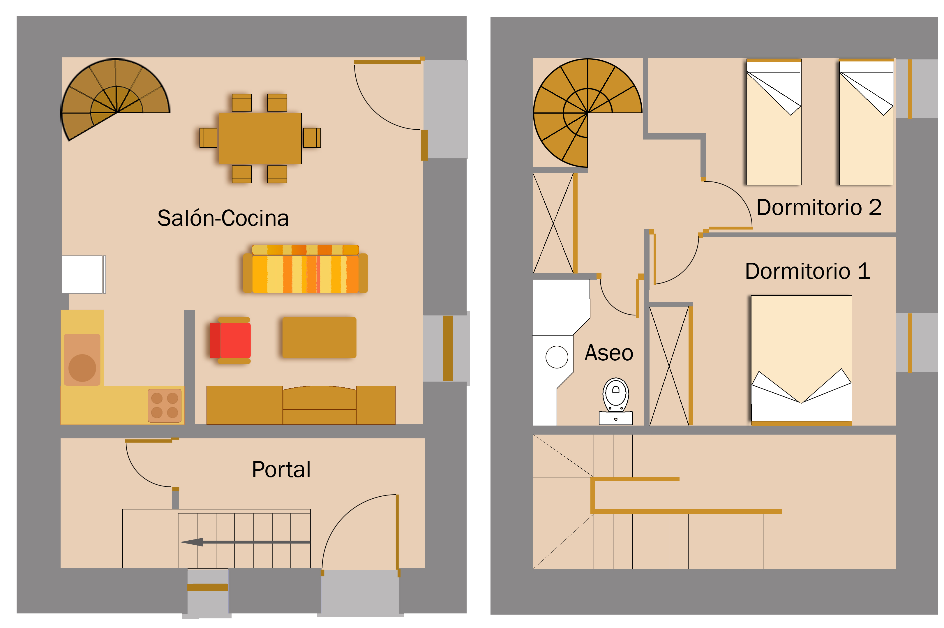 El Apartamento Cucuruzuelo se encuentra situado a pie de calle. Al entrar nos encontramos con el salón y la cocina. Una escalera de caracol nos lleva a la segunda planta, donde un pequeño pasillo une las dos habitaciones con el baño.